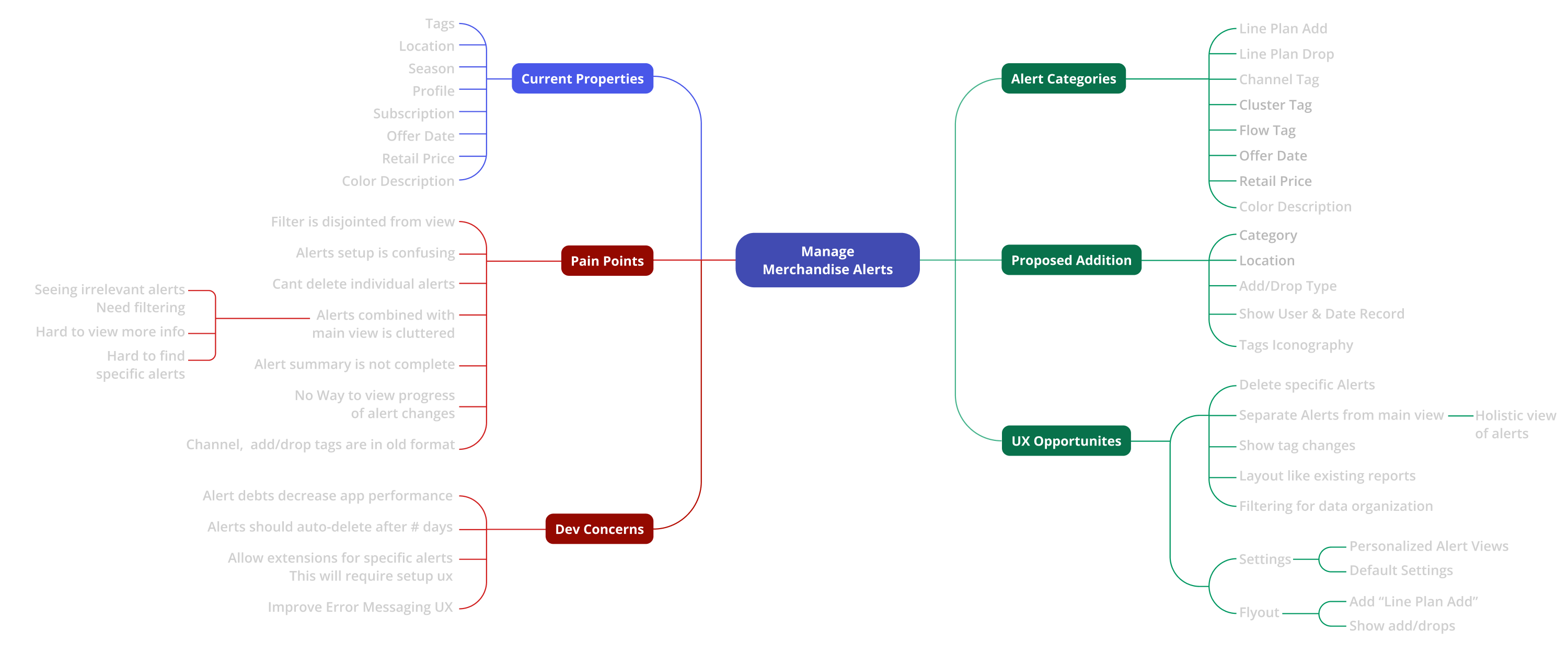 A mind map was made to visualize user interview data and myriad feature requests. The map helped the team prioritize and scope the level of effort for our design strategy. We were able to quickly understand what the concerns were, engage in discussion, and analyze for engineering feasibility based on the non linear insights of the mind map.